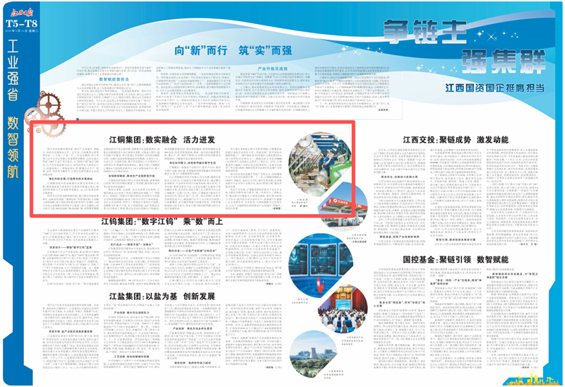 近日,《江西日?qǐng)?bào)》推出“工業(yè)強(qiáng)省 數(shù)智領(lǐng)航”專題,展示江西工業(yè)高質(zhì)量發(fā)展的生動(dòng)實(shí)踐和江西工業(yè)在數(shù)字浪潮中的發(fā)展路徑,在“爭(zhēng)鏈主 強(qiáng)集群 江西國(guó)資國(guó)企挺膺擔(dān)當(dāng)”專版中,詳細(xì)介紹了江銅數(shù)智化建設(shè)工作亮點(diǎn)。