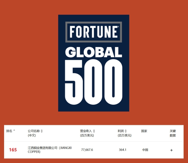 日前,2025年《財(cái)富》世界500強(qiáng)排行榜公布,江西銅業(yè)集團(tuán)有限公司以2024年度776.676億美元營(yíng)業(yè)收入位列榜單165位,這是江銅自2013年以來(lái)連續(xù)13年上榜《財(cái)富》世界500強(qiáng),也是第4年位列榜單前200位。